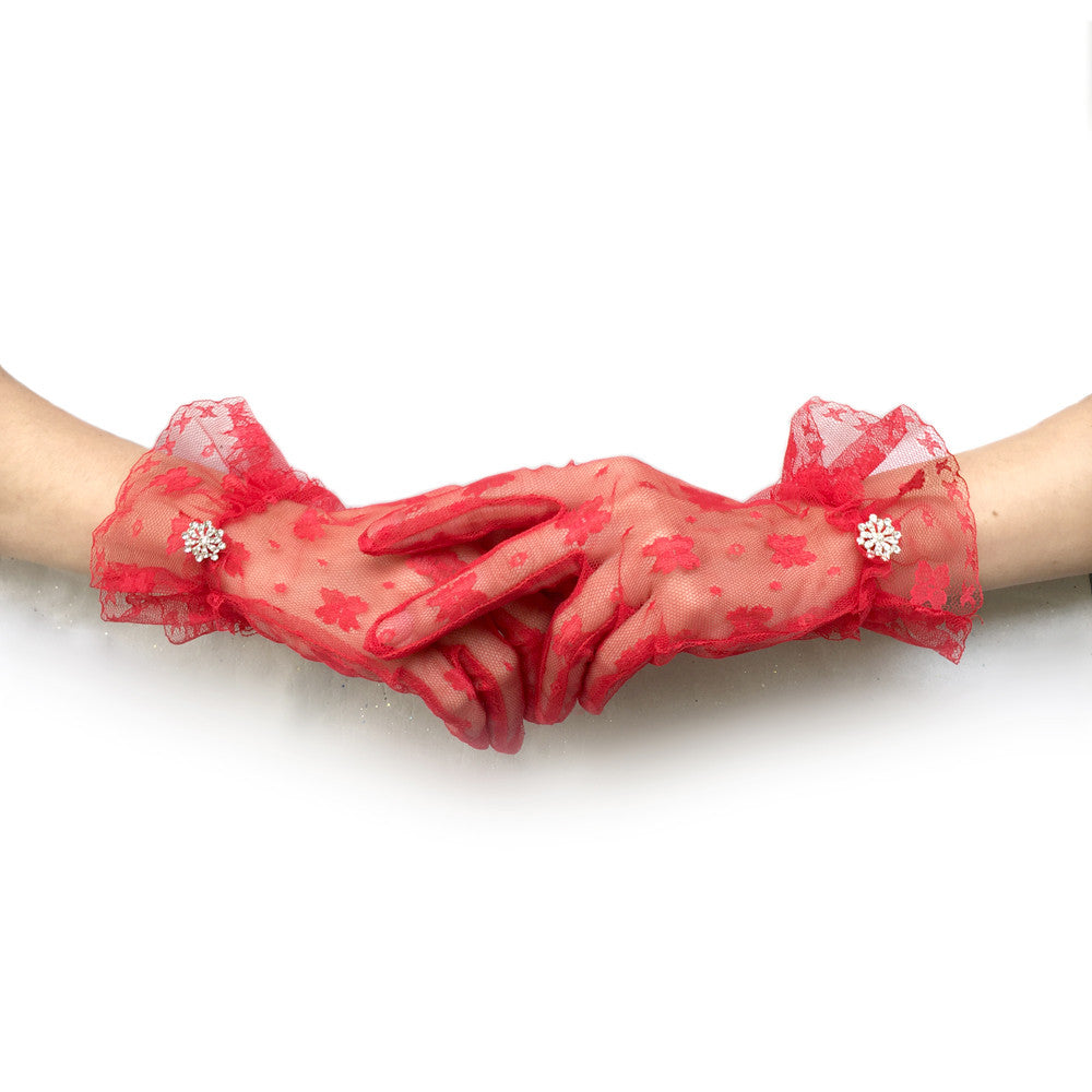 Lovely vintage style red nylon lace gloves without stretch. It is featuring with rhinestone jewellery. Perfect to compliment your outfit for parties and wedding. The sheer lace gives your fingers a lady like appeal, perfect to compliment your outfit for parties and wedding.
