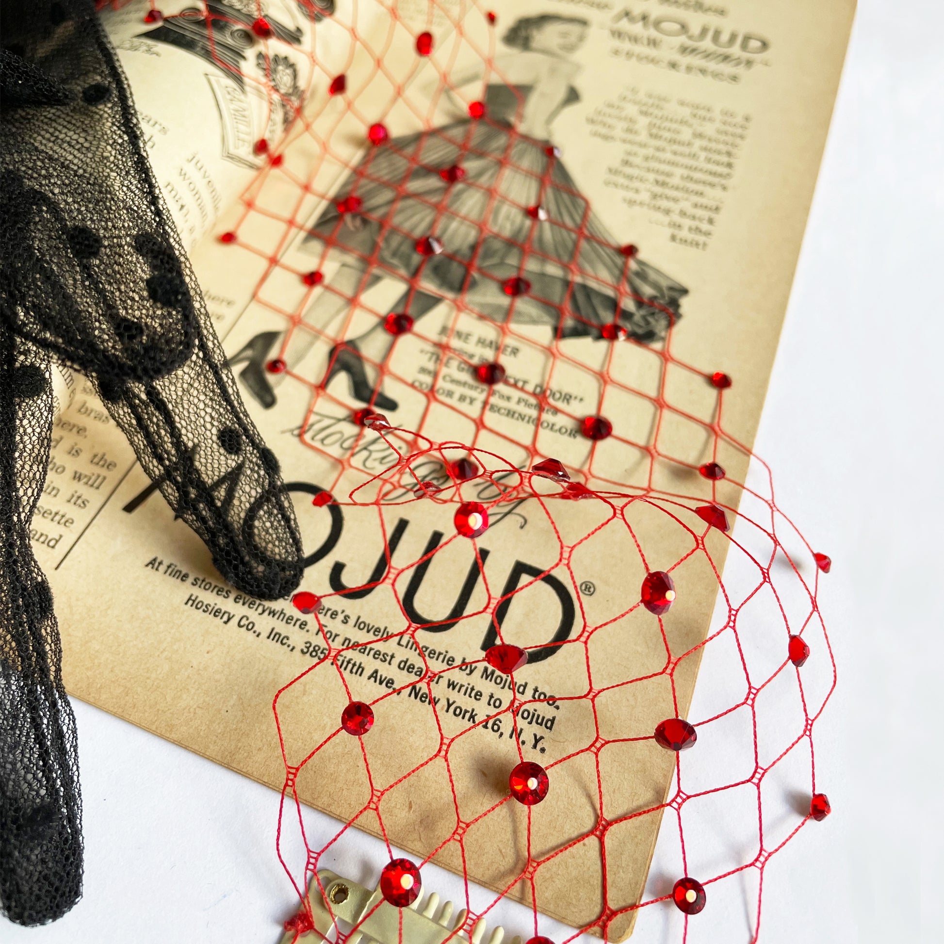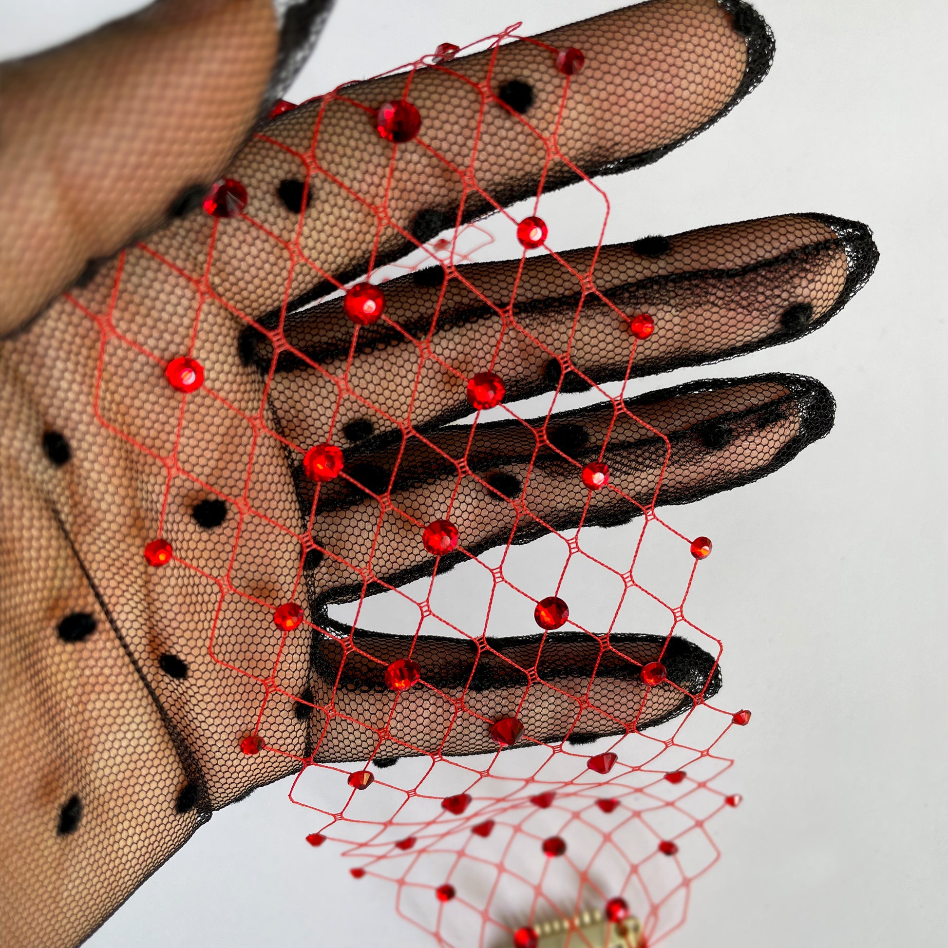 Precioso velo facial de cristal rojo de estilo vintage, perfecto para complementar tu atuendo para celebraciones, fiestas, sesiones de fotos y bodas.