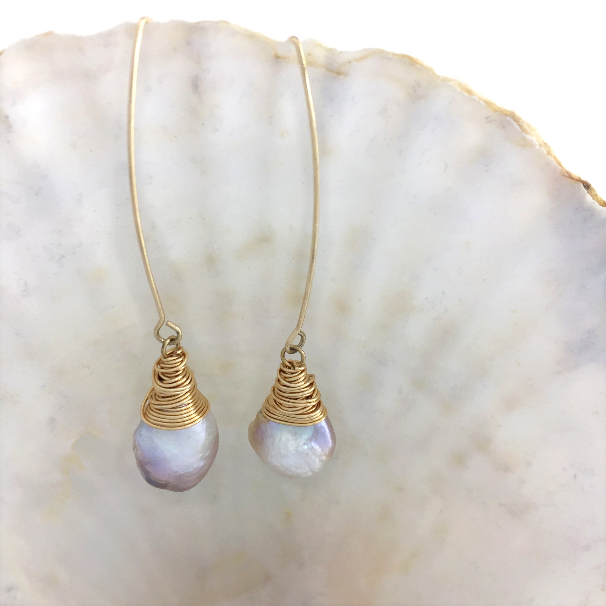 Gorgeous pair of natural baroque pearl dangle earrings in 14K gold, suitable for brides, bridesmaids, parties & all other occasions.
