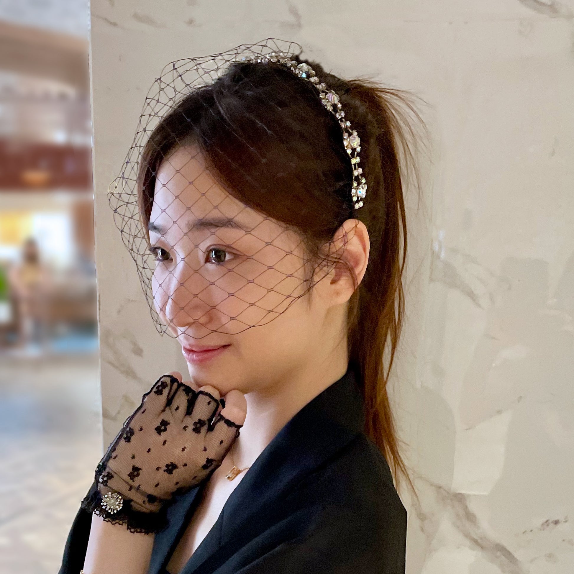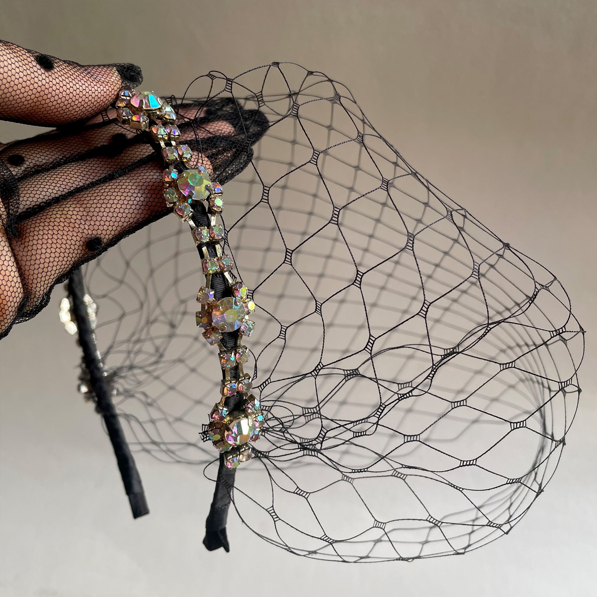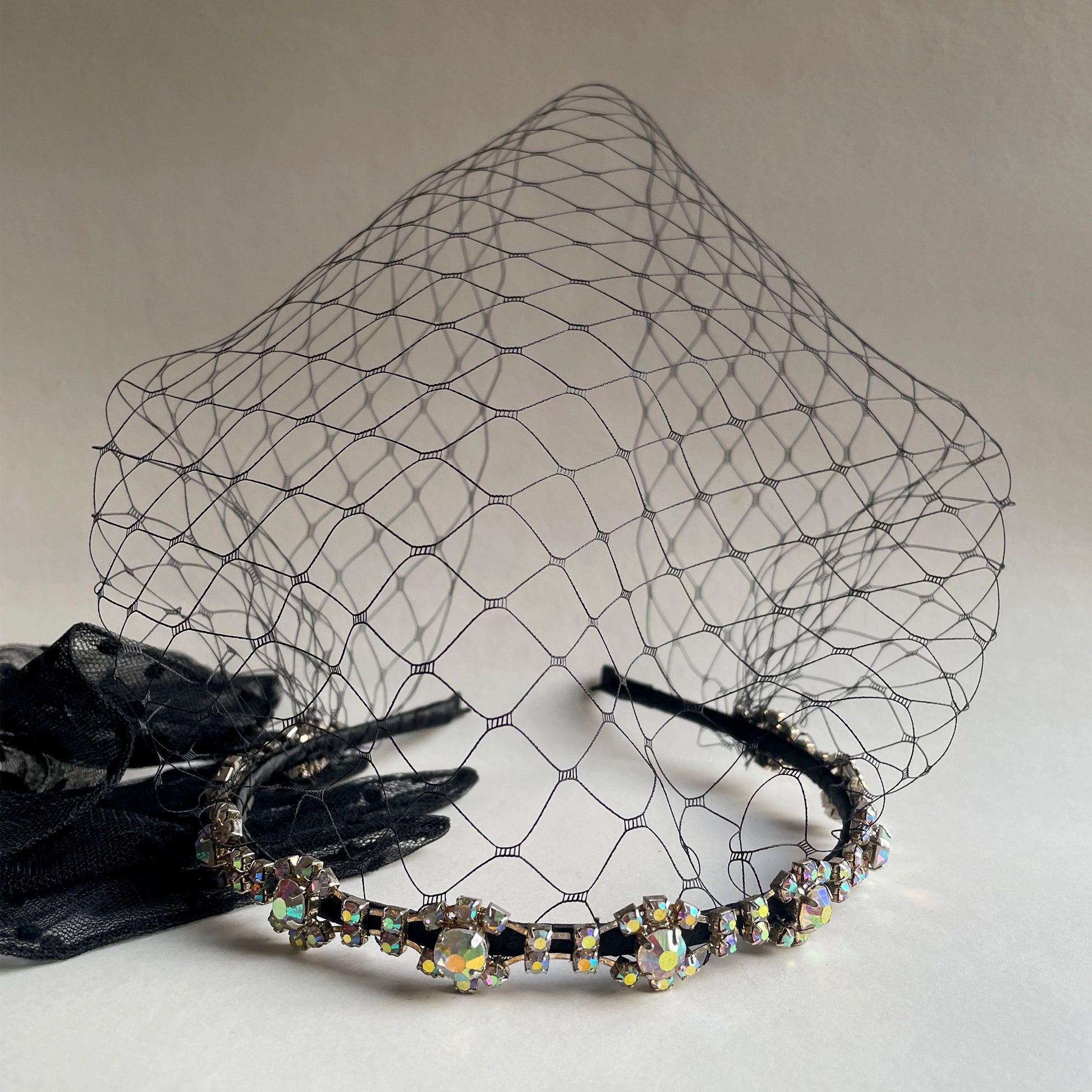 Elegant black birdcage veil with matching colour veil and featuring in AB rhinestone chain. Perfect for party, special event, photo shooting and wedding.