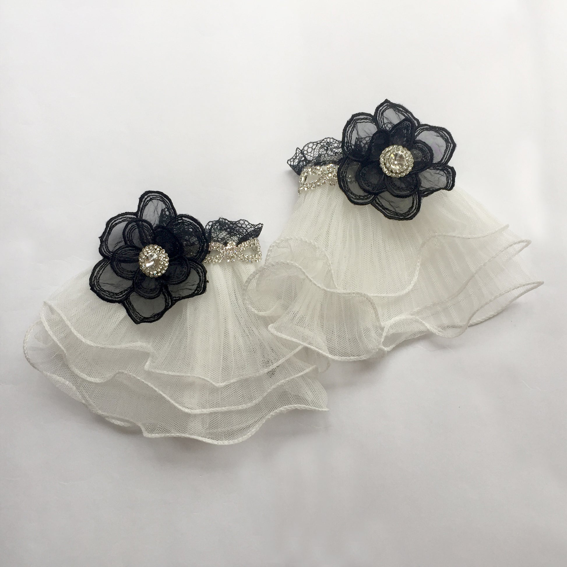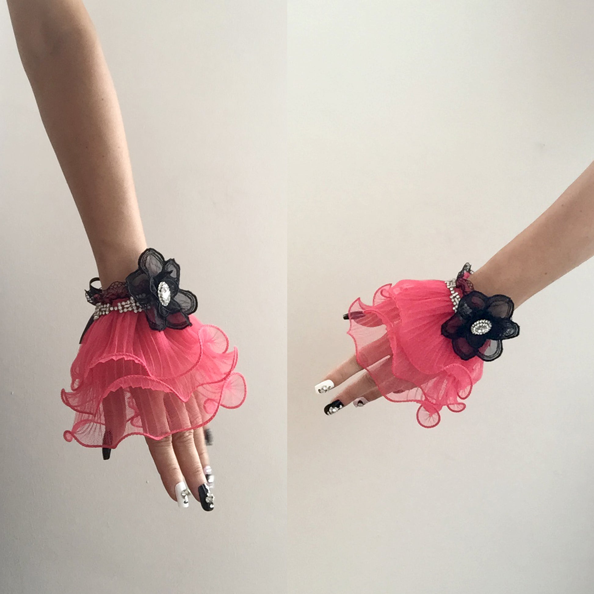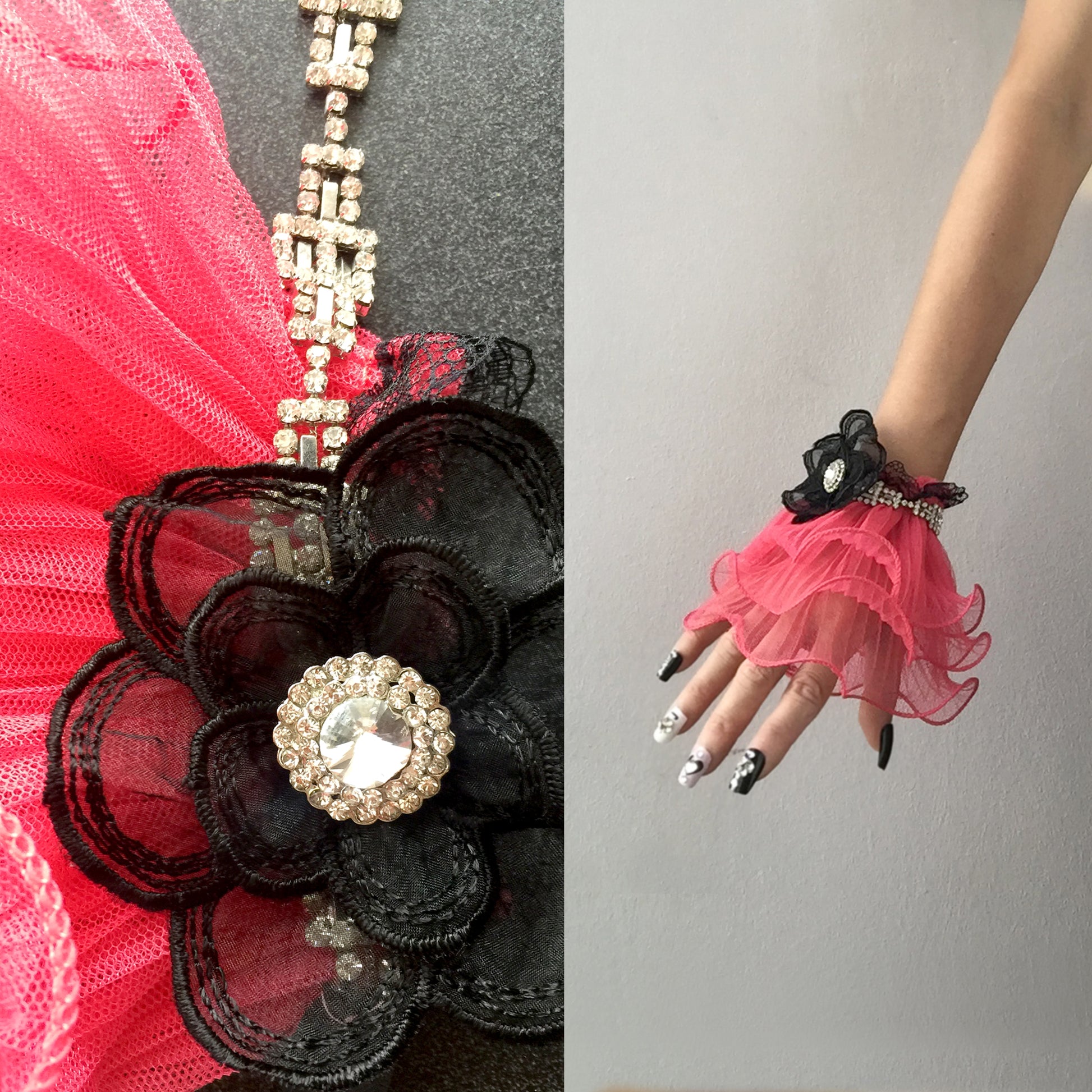 Gorgeous vintage style lace cuff featuring in three layers of soft net with fishing line at hem to add volume. The black floral lace and rhinestone chain at wrist is perfect to compliment your outfit for parties and wedding. The sheer lace gives your fingers a lady like appeal to fit any occasion.